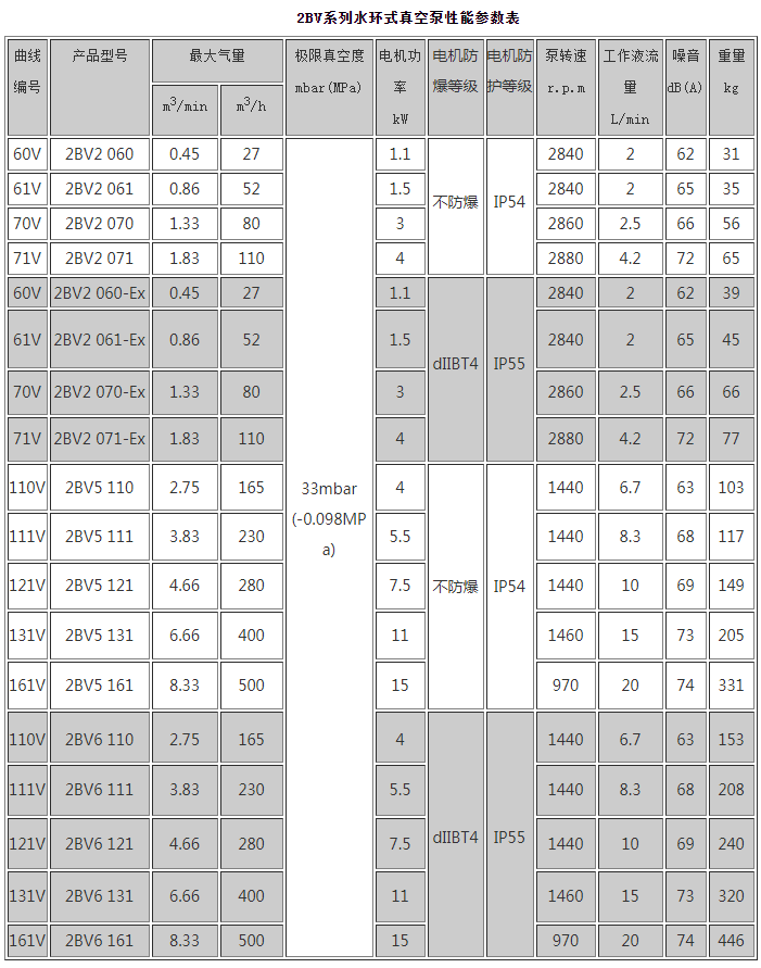 2BV2-Ex、2BV6系列水環(huán)式真空泵/壓縮機(jī)主要用于抽除爆炸性氣體,及在各類易燃、易爆環(huán)境中工作,其性能參數(shù)與2BV2、2BV5系列相同。
