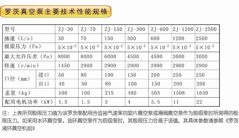 ●不可單獨使用,須配置前級泵。不允許在大氣壓力下啟動,待前級泵將羅茨泵入口壓力抽到允許入口壓力時方可啟動。前級泵一-般為水環(huán)式真空泵、油環(huán)式真空泵、油封式機械泵等。